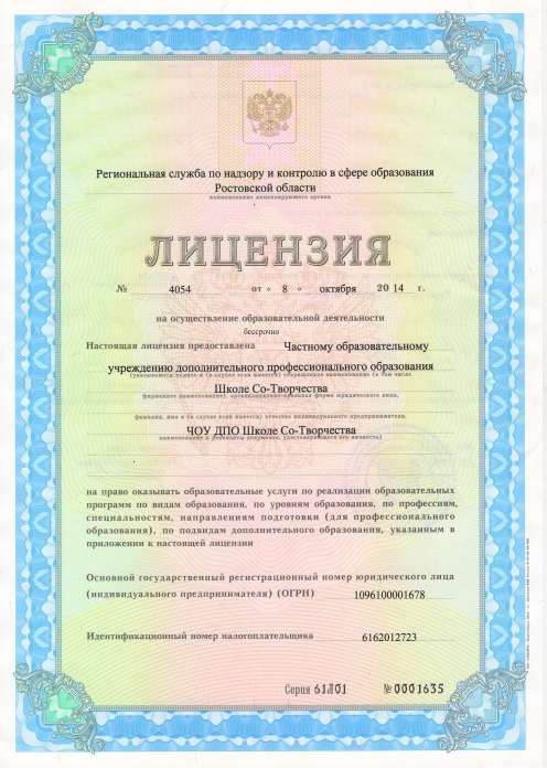Термин “дополнительное профессиональное образование» в рамках деятельности ЧОУ ДПО «Школа Со-Творчества» раскрывается как усвоение знаний и наработка мастерства в принципиально новых дисциплинах, которые применимы в самых различных отраслях деятельности и являются живой необходимостью для любого человека, поставившего задачу ухода от болезней и преображениия, увеличения эффективности основных профессиональных навыков, гармоничного раскрытия в социуме и одновременно неуклонного движения в своём духовном развитии. Слушателям в процессе обучения дается возможность использования новых видов оздоровления и коррекции личностного развития. Они учатся гармонично вписывать свои отношения и дело в мировые процессы в соответствие с переменами, происходящими в мире, выйдут к реализации внутреннего творческого потенциала. Такой подход открывает безграничные возможности управления процессами своей жизнедеятельности и творчества на всех уровнях бытия. А это — путь к долголетию, устранению дисгармонии в развитии общества, к остановке хаоса стихийных бедствий, экологических катастроф, негативного коллективного воздействия человечества на каждого из живущих и окружающую нас природу.